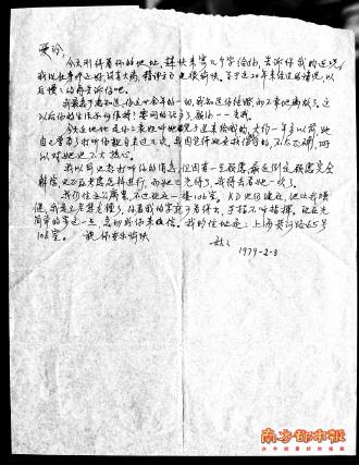 爱玲, 今天刚得着你的地址,赶快来寄几个字给你,告诉你我的近况,我现在身体还好,没有大病,精神方面,也很愉快。至于这20年来经过的情况,以后慢慢的再告诉你吧。 我最急于想知道,你这廿余年的一切,我知道你结婚,而不幸地病故了。这以后你的生活如何维持?要问的话多了,愿你一一告我。 今天这地址是你二表姐叫她儿子送来给我的,大约一年多以前,她自己曾为了打听你亲自来过几次,我因觉得她要找你的目的,不太正确,所以对她也不大热心。 我以前也想打听你的消息,但因有一点顾虑,最近倒是顾虑完全解除,也正在考虑怎样进行,而她已先得了,我得去看她一次了。 我仍住这公寓里,不过现在一楼106室。KD也仍健在,他比我强健,我是已老态龙钟了,你看我的字就可看得出,手指不听指挥。现在先简单的寄这一点,急切盼你来信。我的住址是:上海黄河路65号106室。祝你安乐愉快 姑姑 1979-2-3