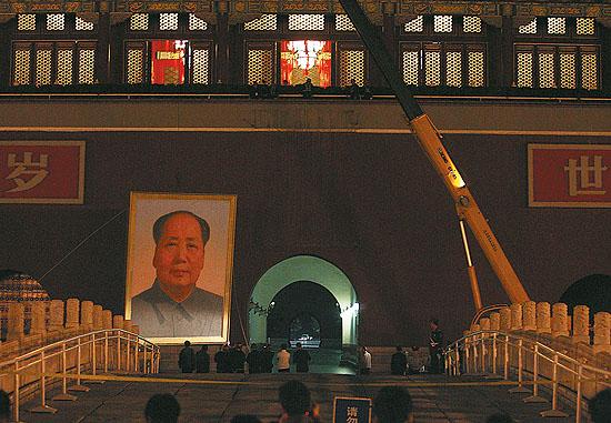 9月27日午夜,起重机将在天安门城楼挂了一年的毛主席像卸下,准备更换新绘制的毛主席像。据了解,悬挂在天安门城楼上的毛主席画像在每年的国庆节前都将更换一次。新中国成立以来,天安门城楼共挂过六种版本的毛主席像,现在悬挂在天安门的毛主席像是1967年10月1日延续至今的版本。本报记者 陈剑摄