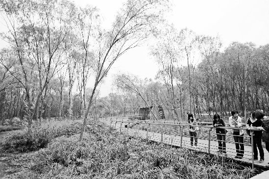 走到公园木栈道上才体会到保安的苦心。“300亩江洋畈,人能踩到的只有30亩左右。”走进公园,只能漫步砂石路、木栈道、公厕和观景台,千万不能越雷池半步——那些看起来香香的、美美的花草、湿地、淤泥可是会“吃人”呢。