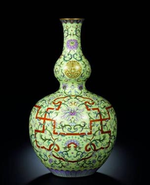 在香港苏富比7日举行的中国瓷器及工艺品拍卖会上,一只清乾隆浅黄地洋彩锦上添花“万寿连延”图长颈葫芦瓶经过足足45口叫价,最终被香港收藏家张永珍收入囊中。中国瓷器及工艺品拍卖世界纪录由此改写为2.5266亿港元。