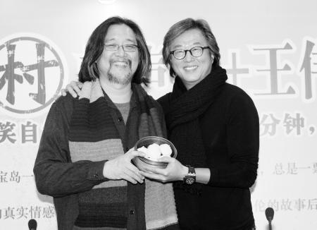 赖声川和王伟忠手捧包子秀“兄弟情”