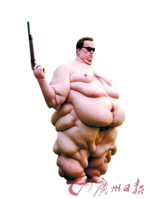 一座220厘米高、以美国明星施瓦辛格为原型创作的“肥胖”雕塑,近日起在锦汉展览中心首届“艺术广东”上展出。其夸张而荒诞的手法呈现出一种诡异的表现力。这是艺术家舒勇于2006年至2008年创作的硅胶雕塑,他表示其创作背景来自因美国爆发的金融危机而引发的全球金融海啸。