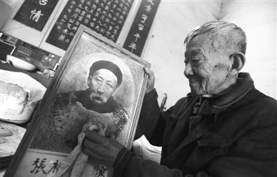 84岁的张庆如在擦拭张裕钊画像。记者陈亮 摄
