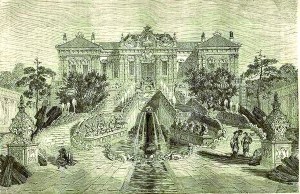 建筑物前面有十个窗口,与阁楼一起在前面排列,两座建筑物的两端也向前突出。这三个部分的大门是用壁柱装饰的,分列在前门的两边。门顺着两边的楼梯一直延伸到庭院和花园。每一个楼梯的两侧都有喷泉,沿着喷泉的轮廓还摆满了盛满花的花瓶。这些楼梯边的喷泉和凡尔赛宫的圣云起到了同样的效果,只是这里的喷泉池壁上刻着部分龙的图画。三角形的水池两侧排列着12种动物,都是不一样的属相,每排六个,中国人叫十二生肖神。人们可以根据这些动物来判断时间,因为在每一天的每一小时,以及一年四季里,这些动物在水池中的倒影都是不一样的。