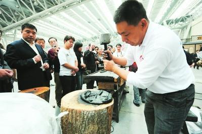 等候了半个多小时,制墨师傅将材料取出,将它放到了“砧板”上,开始锤炼的工序。“锤炼和揉面团的道理一样,粉碎里面的材料,让它变得更粘。不过工具用的是锤子”,程师傅举起一个小锤,在墨团上捶捶打打,看似简单的动作,让外行来做就很难。一位好奇的观众兴冲冲地接过程师傅的锤子,可没敲打几下,就喊没力气了。“可别小看这锤子,每个都有8斤重,要反复敲打近百次,没有一点力量是不行的”,即便是制墨老师傅,锤炼也是个力气活。