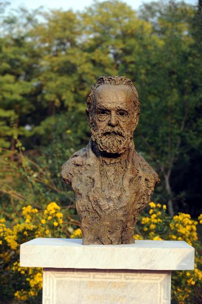 这是10月16日拍摄的雨果雕像。 10月16日,为纪念圆明园罹劫150周年,圆明园举行雨果雕像揭幕仪式,青铜质地的雨果半身雕像正式与游人见面。雕像高84厘米,宽50厘米,重90公斤,位于大水法遗址东侧,在底座上用中法文字镌刻了说明词,表达了“永久呼唤文明与和平的尊重,永久纪念人类的正义与良心”的愿望。在雕像南侧书型石雕上镌刻着雨果强烈谴责1860年英法联军洗劫圆明园暴行的《致巴特勒上尉的信》。雕像由法中友好联合会、中国人民对外友好协会和法国东方华人协会共同捐赠,法国雕塑家娜什拉·凯努制作。新华社记者罗晓光摄
