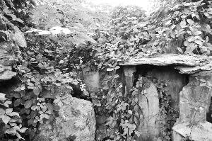在“称岩松”石刻背后不远,更深地“隐藏”着一块四周雕有花纹的石匾,从资料分析,这当是当年流落至此的另一重要文物——泽兰堂乾隆御笔“熙春洞”,但刻字却已模糊到几乎湮灭无踪的地步。