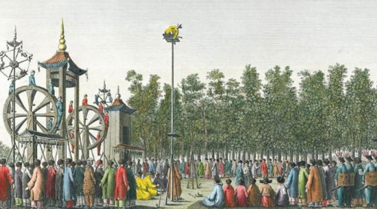 清代,北京圆明园中的庆典节目表演。1808年出版的《北京游记》插画,M.De.奎根绘。