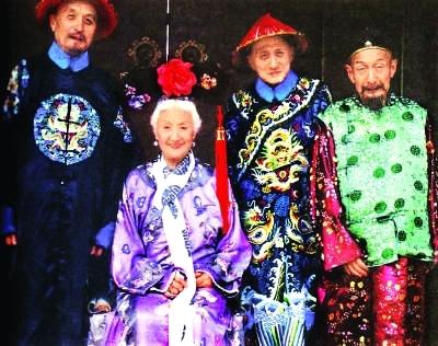 2002年,黄宗江(左三)兄妹4人共同参加了电视剧《大栅栏》的演出。(资料照片)
