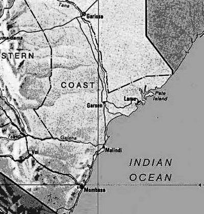 肯尼亚项目点局域图,自下而上的沿海3个地区名称分别是蒙巴萨、马林迪和拉穆群岛。