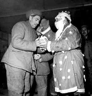 朝鲜碧潼战俘营,战俘化装成圣诞老人给与会者发圣诞包。
