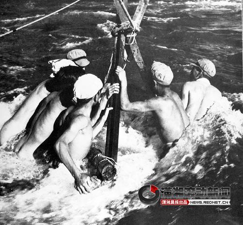 (1951年夏,抗美援朝的志愿军铁道兵团战士在洪水中抢修铁路。图/fotoe)