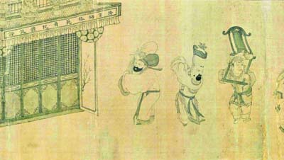 这幅图里,十三名艺人个个装扮各异,动作诙谐,带有傀儡和戏曲韵味。舞队第一人为领队班首,也是节目主持人。其他演员全部戴假面,或张大嘴嘻笑,或抬腿做单腿跳跃状,或装着扑蝴蝶……最值得注意的是演员们无论做何种动作,都离不开模仿傀儡的态势,其表演都在合着一个鼓点进行。