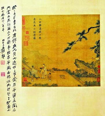 《王宏送酒图》除了体现马远的画风之外,右上端有宋宁宗皇后杨妹子意味深长的题诗:“人世难逢开口笑,黄花满目助清欢”。
