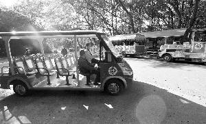 昨天下午,记者在陵园大道上看到一辆崭新的蓝白色电瓶车,上面写着中山陵西站—明孝陵博物馆。开车的女司机显然是新手,正在学习培训阶段,熟悉路况。