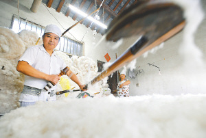 刘鸿喜的弹棉花铺,生意一直挺红火。他说:“附近的老年人还是喜欢用我弹的棉花被。”
