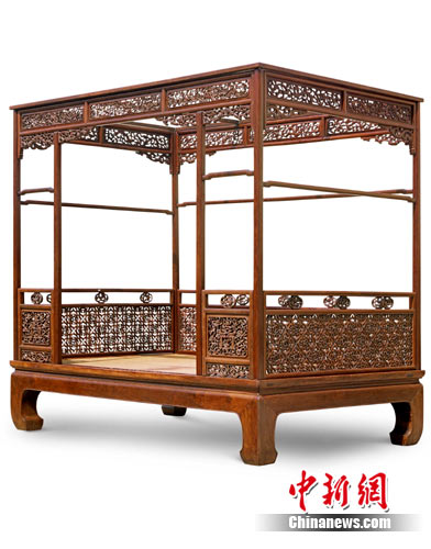 中新网北京11月21日电 题:嘉德秋拍创黄花梨家具拍卖新纪录——“明 黄花梨簇云纹马蹄腿六柱式架子床”4312万元人民币高价成交