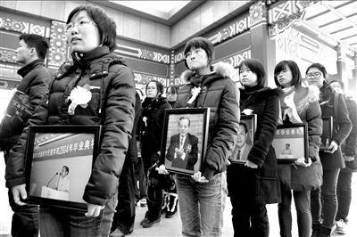 清华大学新闻与传播学院150余名师生,带着范老生前上课、讲座的相片前来悼念。“他的音容笑貌犹在眼前”,不少毕业生自发赶来,流泪回忆与“范爷爷”度过的点点滴滴。由清华学子主办、范老题写报头的《清新时报》,连夜赶制纪念特刊,在场外送给悼念者,并有5份随范老一起火化。 (记者商西)