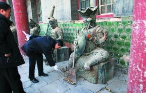 昨日,孚王府,北京市文物局局长孔繁峙在查看府内的一尊塑像。本报记者 薛珺 摄