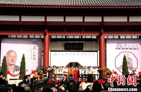 中新网扬州11月26日电(记者 崔佳明)鉴真大师再度归来,中日友好人士、国内外著名学者、教授、高僧大德会聚鉴真故里。26日,扬州在大明寺鉴真图书馆隆重举行日本东大寺鉴真坐像回乡“省亲”揭幕仪式。揭幕仪式在古筝演奏曲《东渡》和圣歌《三宝颂》的超越时空的意境演绎之中,拉开了的帷幕。