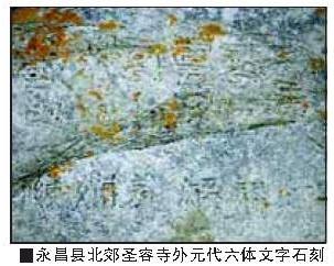 在永昌县城北郊圣容寺外有一处六体文字石刻,记者前不久为撰写“走进绝学系列之一:走进梵文”时,曾经看到在居庸关云台内壁就刻有六体文字。记者对这处石刻很感兴趣,一大清晨就来到圣容寺,在寺外遍寻不见,只好走入寺内询问,经过寺内法师的指点,记者才在寺外河滩对面山崖上找到这处六体文字石刻,分别是八思巴文、畏兀儿文(回鹘式蒙古文)、西夏文、汉文、梵文、藏文,与居庸关云台六体文字石刻的文字类型是一样的,只是内容更为简单,为藏传佛教六字真言。据中国社会科学院民族学与人类学研究所研究员史金波介绍,全国目前只在北京居庸关云台、永昌石刻、敦煌莫高窟碑发现有三处六体文字石刻,是非常重要的物质遗存。