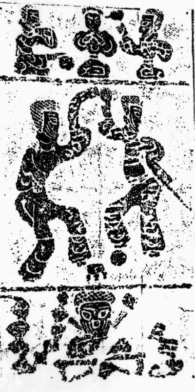 汉画中的蹴鞠可以分为两种类型:一种是蹴鞠与舞乐相伴出现。南阳出土的蹴鞠活动,或有乐队伴奏,或有杂技相随,或边蹴边舞。比如1977年10月,南阳方城县城关出土一汉墓,在该墓南门北扉背面,刻画有蹴鞠图(见图一):画面上部为三人奏乐,中部刻二人相向蹴鞠起舞,足下有一球状物和一鼎形器,下刻一人凭几而坐。蹴鞠既是一种体育运动,同时又是舞乐百戏的一个组成部分。