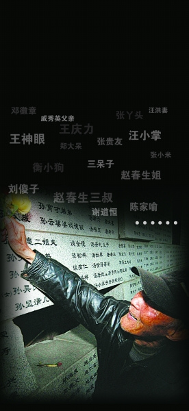 记者拿到部分即将刻上“哭墙”的姓名,发现有的遇难者无姓也无名,比如三呆子、二道标等;有的有姓但无名,比如刘傻子、王老二、许小四等;还有的只是某某人亲戚,比如赵春生三叔、赵春生姐、戚秀英父亲、庞世昌哥哥等。