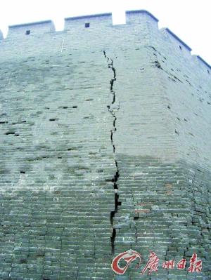 因年久失修平遥古城墙出现了裂缝。