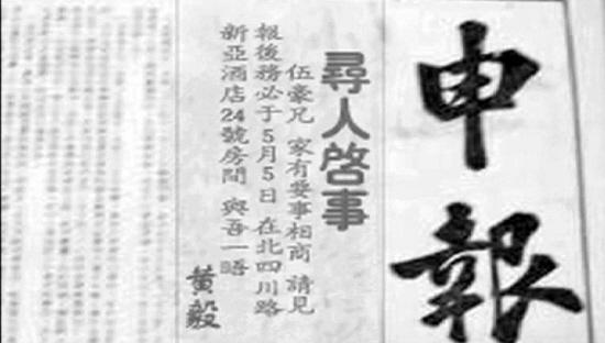 1936年4月的一天,上海《申报》忽然在显著的位置,刊出了一条醒目的《寻人启事》。被寻者名叫“伍豪”,启事要求他于一个月之后,在北四川路新亚饭店,与寻人者黄毅见面,原因是:家有要事相商。