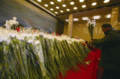 8时30分,记者来到毛主席纪念堂北大厅。毛主席的白色坐像前,摆放着一排社会各界敬献的花篮。