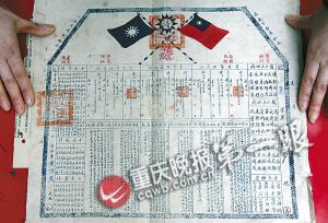 江北区的收藏爱好者王先生,近日偶然淘得一份1943年国民党当局颁发给青帮嘉白帮头的执照,上面完整地记录了当时青帮各种繁琐的规矩、各省帮头情况等。专家认为,这对研究神秘的青帮组织具有很大作用。
