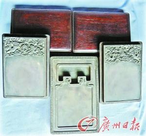记者昨天在何先生的藏室见到了这3方贡砚。两方清代“端溪贡品”端砚是图案对称的对砚,材质为名贵的老坑大西洞石,石品丰富,上雕精美的“双龙戏珠”图案,长15厘米,宽10.5厘米,高2厘米。对砚各装在一个紫檀木盒里,再放入一个外面刻有“端溪贡品”的双层金丝楠木盒中,原汁原味,古色古香。