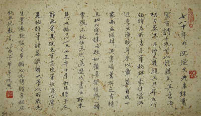 尚未在别处见到过沈从文谈论自己的书法,故此题跋有特殊意义。难得的是,苗子先生为此幅书法特地补写一题跋简述沈从文的书法艺术(见图二):