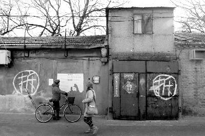 上图:北京市西城区米市胡同43号院内,破败不堪的康有为故居;下图:在北京市西城区砖塔胡同84号鲁迅故居院外,行人正在驻足观看贴在墙上的拆迁通知。记者 陈 曦 摄
