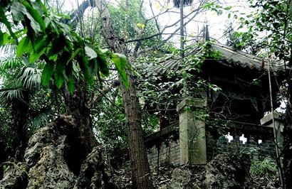 走近停车场东南隅的树丛,一大片连绵起伏的假山上挂满了青苔与草木,参天大树根植其上。假山脚下垃圾遍地,但依然可以寻到青石板的台阶。蜿蜒而上,在约十余米的最高点上,竟是一座木质六角凉亭,一大一小两尊石佛立在庭中,表面虽斑驳不已,雕刻却无比精致。亭柱虽早已在岁月的长河中褪却了朱红的原色,但牡丹、凤凰等雕刻却栩栩如生。