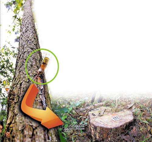 “而那些没有砍掉的松树,很多也生病了。”陈先生带记者来到一棵松树,只见上面插着两根针,正往松树中注射液体。而记者不止一次看见,林间树木上挂着一个类似“气风灯”的仪器,“这些树得了松材线虫病,给它们打针是为了救它们。而那些仪器叫诱捕器,用于捉拿天牛之用。如果这两个东西都没有作用,松树就会死亡,我们最后只能砍掉。”