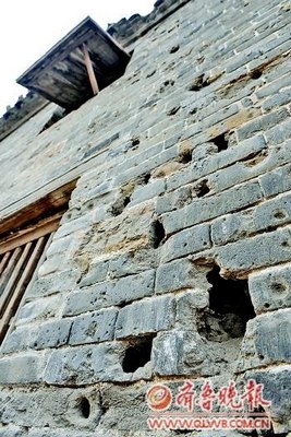▲在台儿庄古城内的一处民宅上,当年台儿庄大战留下的弹孔还清晰可见。