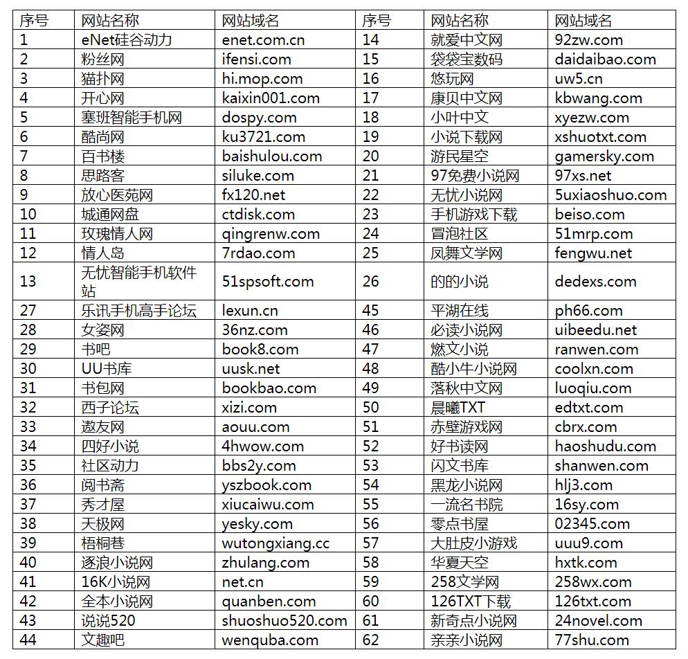 中新网北京6月13日 据新闻出版总署网站消息,近日,新闻出版总署对62家涉及登载(传播)淫秽色情网络出版物的网站进行了查处。被查处网站名单如下: