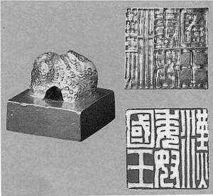 《后汉书·光武帝本纪》和《后汉书·东夷传》中记载“建武中元二年(公元57年)倭奴国奉贡朝贺,使人自称大夫,光武赐以印缓。”这枚金印后来不知所踪,直到1784年,才在九州的福冈,由名叫秀治和喜平的二位佃农,在耕作挖沟时偶然发现。金印印面正方形,边长2.3厘米,印台高约0.9厘米,台上附蛇形钮,通体高约2.2厘米,上面刻有“汉倭奴国王”字样,清晰的说明了倭国是汉朝的附属,是中日外交史上最珍贵的文物。