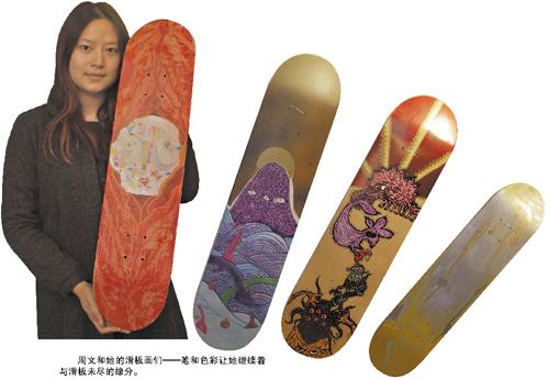 周文说,滑板始终是心中未解的情结和难言的伤痛。2008年年底,好友的极限运动用品店开业,邀请了很多圈内朋友在滑板上作画。这是周文第一次用笔在滑板上画画,也让美术专业出身的她爱上了这种作画方式。此后,周文陆续有滑板画作品成形。2010年1月初,周文的滑板画和朋友作品一起,在小型三人联展中展出,反响不错。那年夏天在厦门的一个滑板场边,看着玩滑板的人,她突然觉得或许自己不用和滑板告别。