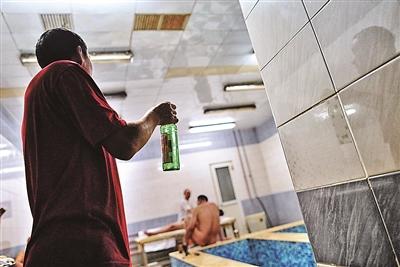 一天的工作快要结束了,搓澡工田师傅坐在池边抽支烟短暂休息一下