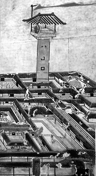 古代城市里的望火楼,楼上有旗亭,在发生火灾时会击鼓报警,并用旗帜指明方向。