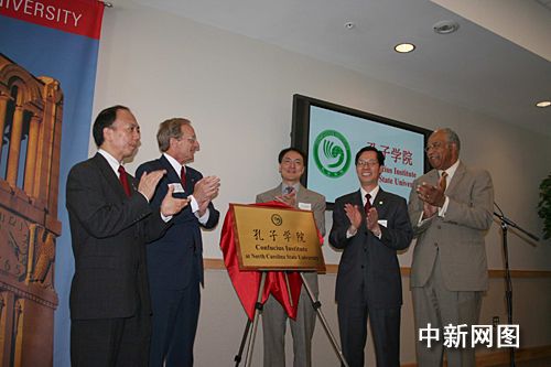 中新网华盛顿4月23日电 (马儿 胡晖)当地时间今天,座落在北卡首府罗丽市的北卡州立大学 Carroll Joyner接待中心张灯结彩、宾客盈门,洋溢着一派喜气洋洋的气氛。北卡州立大学孔子学院的揭幕典礼在这里隆重举行。
