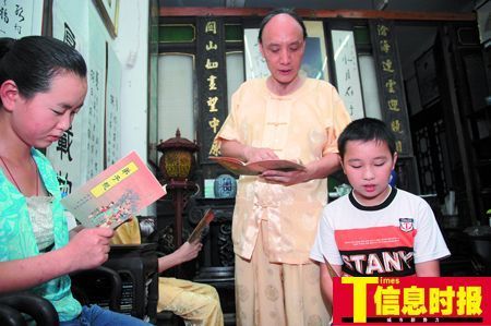 昨日下午,记者来到文明路89号,看到来上课的小孩只有寥寥数人,从6岁到十几岁的都有,“这些孩子有的从汕头来,有些来自湖南,广州的也有一些,都是暑假时来这里上课。其实,一般上课最好不超过三人,”身穿金色古装、蓄着清代长辫的州迪说,平时他都是以古装授课,让孩子们在充分感受中国传统文化的氛围中学习。