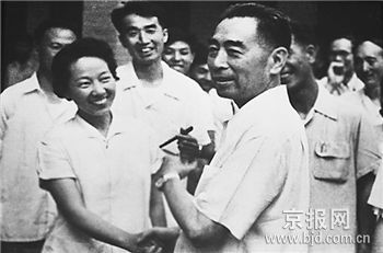 那是1961年,在香山举行了一次有关电影方面的会议,这一天,周总理来到了现场。于蓝个头不高,站在众多名演员中间,一点都不起眼,可周总理还是一眼就看见了这位《革命家庭》中的妈妈,上前亲切握着于蓝的手,当着众人说道:“你演了个好妈妈!”声音很大,好像是有意在给别人听,还有意侧了一下身,一旁的新闻记者迅速举起相机抓拍到了这一珍贵瞬间。
