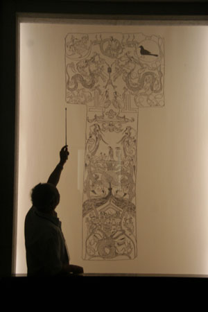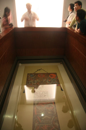 中新网9月11日电 “中国网络媒体湖南游”采访团一行今天上午走进湖南省博物馆,重点参观了1972年出土的长沙马王堆汉墓文物。图为1号墓出土的T型帛画,长2.05米,绘有天上、人间和地下的景象,神话与现实浑然一体,作为墓主人“引魂升天”的“铭旌”而埋入墓中。