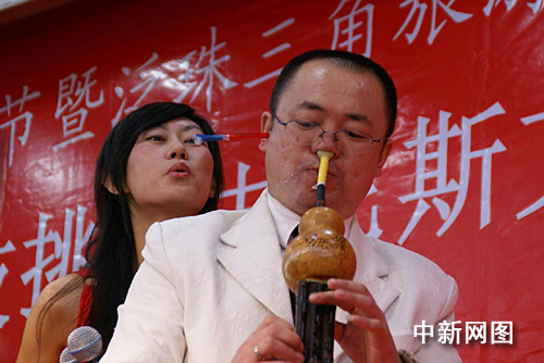 记者在新闻发布会上看到,来自东北的崔孩亮现场表演鼻子吹葫芦丝和耳朵吹泡泡、吹蜡烛、100米塑料管吹打火机等绝技。