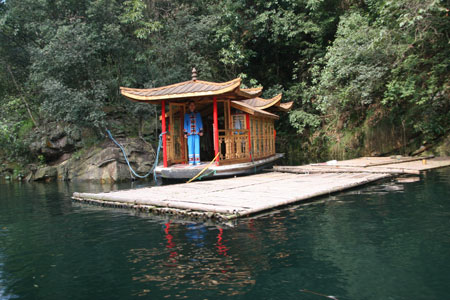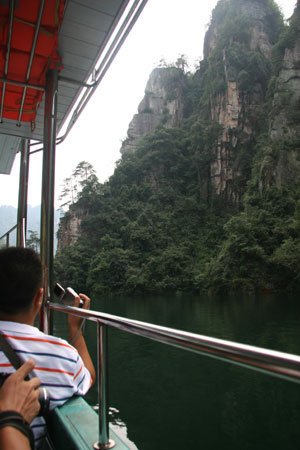 中新网9月16日电 “魅力湖南·2007中国网络媒体湖南游”采访团16日参观了著名的张家界景区,记者一行泛舟宝峰湖上,与土家族姑娘对起了山歌。