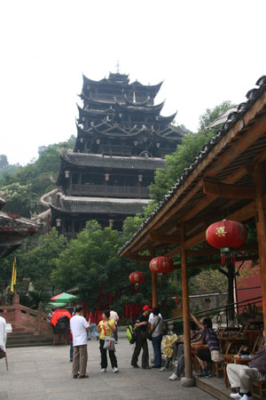 在导游带领下,众人参观了土家族千百年来文化展示。其中,最引人注意的当属吊脚楼九重天。据悉,这座48米,共12层的吊脚楼,整栋楼竟无一根铁钉,堪称土家吊脚楼建筑史上的奇迹,并于2002年9月被评为最高吊脚楼,荣获世界吉尼斯之最。
