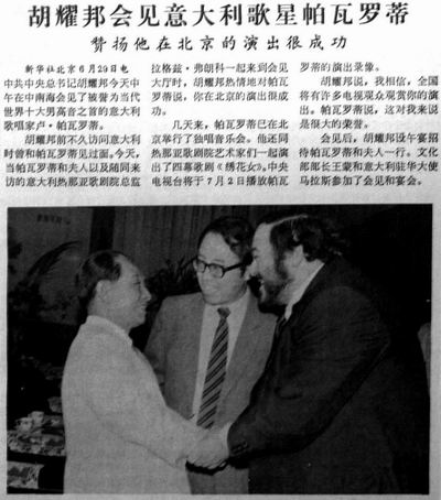 1986年6月22日至7月4日,热那亚歌剧院在北京天桥剧场演出了6场歌剧《波西米亚人》,其中3场由帕瓦罗蒂出演。此外,帕瓦罗蒂还分别在北展剧场和人民大会堂举行了两场个人音乐会。依照中国“专业界”人士的标准,帕瓦罗蒂个人演唱会同样不太适合进入大会堂。但是帕瓦罗蒂成功了,他成了第一个在人民大会堂举办个人音乐会的外国人(其实中国也没人享受这份殊荣)。大会堂的那场演唱会,是经过胡启立提议、胡耀邦拍板决定临时从北展移到大会堂的。这成为1986年帕瓦罗蒂访华的高潮,音乐会结束时,在一遍又一遍的谢幕之后,帕瓦罗蒂即兴发表讲话,表达了他的激动与感激。从大会堂出来,坐上红旗轿车,他对身边的人说:“今晚是我艺术生涯的顶点。”
